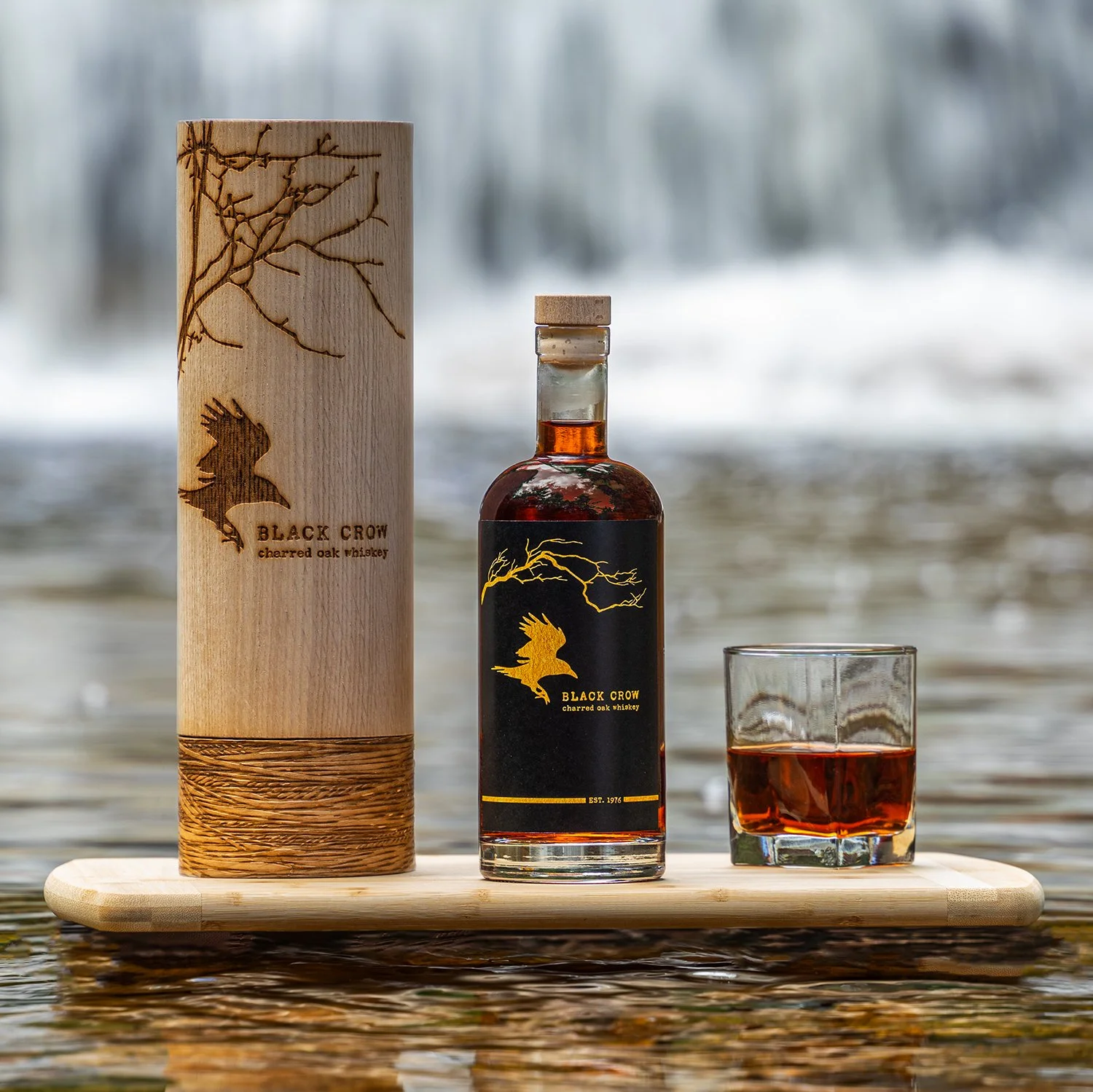 The packaging of Black Crow highlights the qualities of this fictitious drink: strong, smoky, single batch whiskey, aged in charred oak. Designed to resemble a barrel, the case is made from a simple cardboard tube laminated with an inexpensive oak veneer. Once opened the bottle appears sitting in a nest of shredded paper, which also protects the bottle during shipping. This makes the packaging much more environmentally friendly than most.